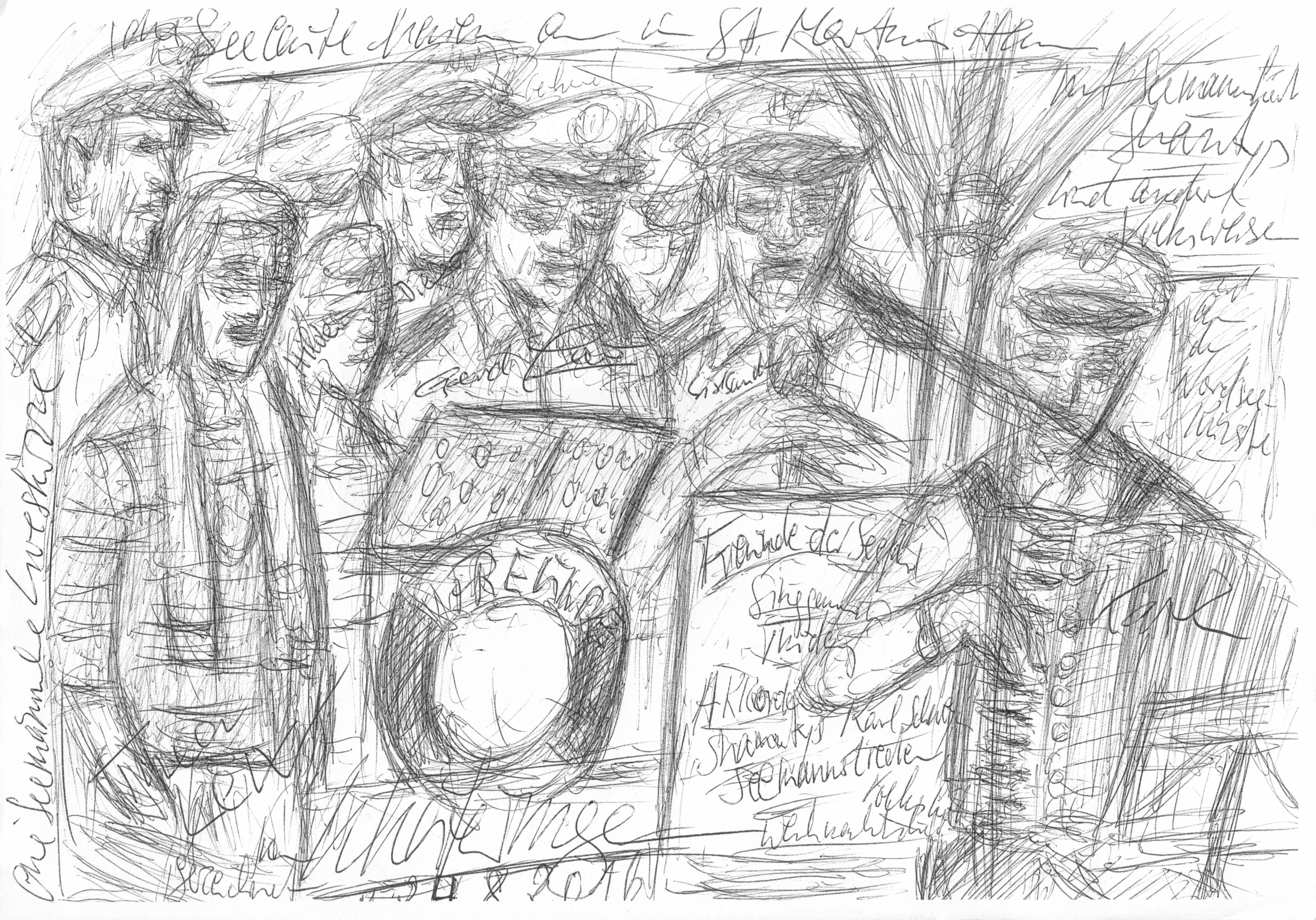Sommer 2016: eine Zeichnung von Jürgen Schäfermeyer im Garten des München Stift, Haus St. Martin